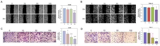 Having established that olivomycin A exerts an antiproliferative effect on renal cancer cells, we next investigated whether it also impacts their migratory capacity. Wound healing assays revealed that 100 nM olivomycin A significantly suppressed migration in both A-498 cells (Figure 3A) and 786-O cells (Figure 3B). The time-course data with multiple time points are provided in Supplementary Figure S1. The results consistently showed that olivomycin A markedly delayed wound closure in both cell lines compared with controls. This inhibitory effect was further validated using Boyden transwell assays, which showed pronounced migration suppression at concentrations as low as 10 nM for A-498 cells (Figure 3C) and 50 nM for 786-O cells (Figure 3D).