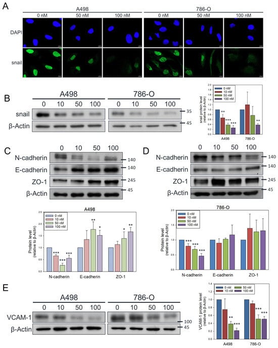 Attenuated effects of olivomycin A on Snail, epithelial–mesenchymal transition markers, and VCAM-1 in renal cancer cells. (A) Confocal microscopy of nuclear Snail (green) and DAPI (blue) staining. Cells were treated with olivomycin A and a vehicle control and subjected to immunofluorescence analysis. Representative confocal images demonstrate reduced nuclear localization of Snail in olivomycin A–treated cells compared with controls. (B) Western blot analysis showing that olivomycin A markedly attenuated Snail protein expression in both A-498 and 786-O cells. (C) In A-498 cells, olivomycin A significantly reduced N-cadherin while upregulating E-cadherin and ZO-1 expression. (D) In 789-O cells, olivomycin A significantly downregulated N-cadherin and modestly increased E-cadherin and ZO-1 expression. (E) Olivomycin A also significantly reduced VCAM-1 expression in both A-498 and 798-O cells. Cell lysates were resolved by SDS-PAGE and analyzed by Western blotting, with β-actin used as a loading control. Representative blots are shown. Quantitative data represent means ± SE from three independent experiments performed in triplicate (* p < 0.05, ** p < 0.01, *** p < 0.001 vs. control).