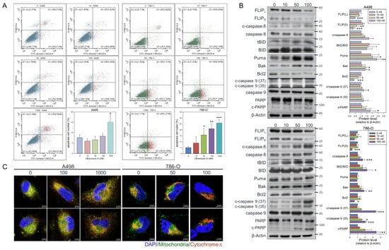To further elucidate the molecular events underlying olivomycin A-induced cell proliferation inhibition, we explored the cell death pathway and related signaling mechanisms. Since olivomycin A has been reported to induce apoptosis in cancer cells [13,15,17], we employed Annexin V staining and flow cytometry to analyze the apoptotic populations in our experimental system. Our results showed that olivomycin A effectively induced apoptosis at 1 μM in A-498 and at 50 nM in 786-O cells (Figure 5A). To clarify the apoptotic pathways contributing to this olivomycin A-mediated growth inhibition, we conducted protein expression analysis. In A498 cells, both isoforms of the antiapoptotic protein, FLIP, were significantly downregulated by olivomycin A; however, this was not accompanied by caspase-8 activation or Bid truncation. Instead, we observed upregulation of Puma, Bak, and activated caspase-9 (Figure 5B top panel). These results indicate that olivomycin A activated the intrinsic apoptotic pathway in A-498 cells. By contrast, we observed downregulation of FLIP and upregulation of activated caspase-8, truncated Bid, Puma, and Bak, accompanied by a reduction in the antiapoptotic protein, Bcl-2, as well as caspase-9 activation and PARP cleavage (Figure 5B bottom panel). We further examined cytochrome c localization and found that, consistent with the flow cytometry data (Figure 5A), olivomycin A promoted its release from mitochondria into cytoplasm, with a more pronounced effect in 786-O than that in A498 cells (Figure 5C). Collectively, these findings indicate that olivomycin A triggers apoptosis in renal cancer cells primarily through mitochondrial (intrinsic) signaling, with caspase-activation suggesting potential cross-talk between apoptosis cascades rather than definitive involvement of a receptor-mediated extrinsic pathway.