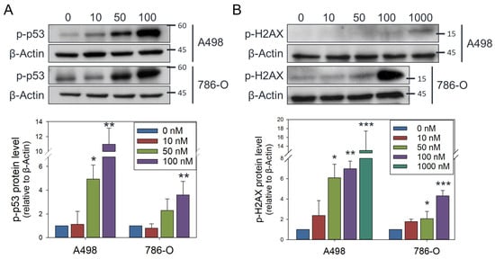 Olivomycin A induces DNA damage signaling in renal cancer cells. (A,B) Western blot analysis showing that olivomycin A provoked expression of phosphorylated p53 (A) and H2AX (B). Cell lysates were resolved by SDS-PAGE and probed by the indicated antibodies, with β-actin used as a loading control. Representative blots are shown. Quantitative data represent means ± SE from three independent experiments performed in triplicate (* p < 0.05, ** p < 0.01, *** p < 0.001 vs. control).