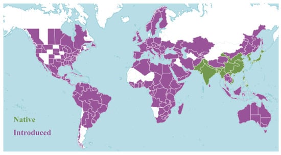 O. corniculata exhibits a nearly global distribution, thriving across tropical, subtropical, and temperate regions (Figure 2). Native to Asia, particularly East, South, and Southeast Asia, it has since naturalized across Europe, the Mediterranean, Oceania, and the Americas []. The species grows most vigorously at elevations of 500–1500 m, with higher density and frequency observed during the rainy season []. It commonly colonizes roadsides, grasslands, field margins, and forest edges, especially in moist or human-disturbed habitats. Its ecological success is largely attributed to adaptive growth habits and versatile reproductive strategies, which support survival and dispersal across diverse environments [].