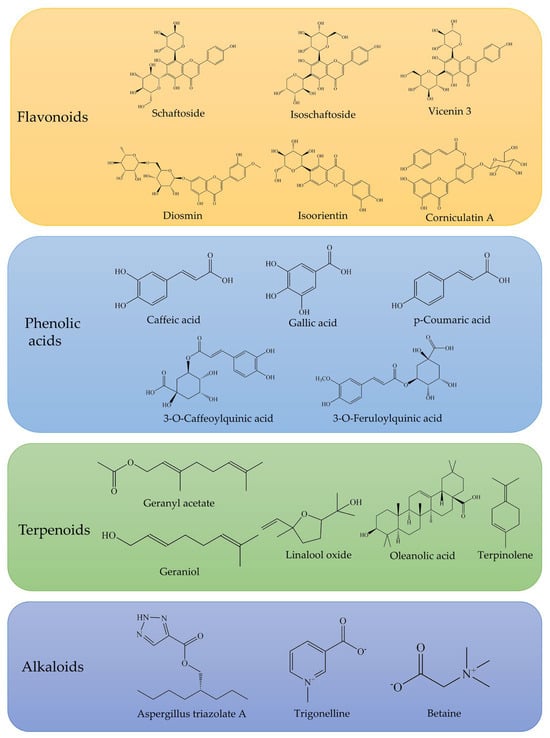 Supercritical CO2 extraction followed by GC/MS analysis of leaf samples from Guangdong Province, China, revealed that monoterpenes dominate the essential oil fraction []. The most abundant constituents were geranyl acetate (13.3%), terpinolene (9.2%), linalool oxide (7.4%), and geraniol (6.4%). These compounds impart characteristic aromatic properties and exhibit antioxidant, antimicrobial, and anti-inflammatory activities []. In addition to volatile monoterpenes, several triterpenoids have been detected in the non-volatile fractions, including oleanolic acid, eburicoic acid, squalene, and phytol [,]. The chemical structures of the identified terpenoids are shown in Figure S4.