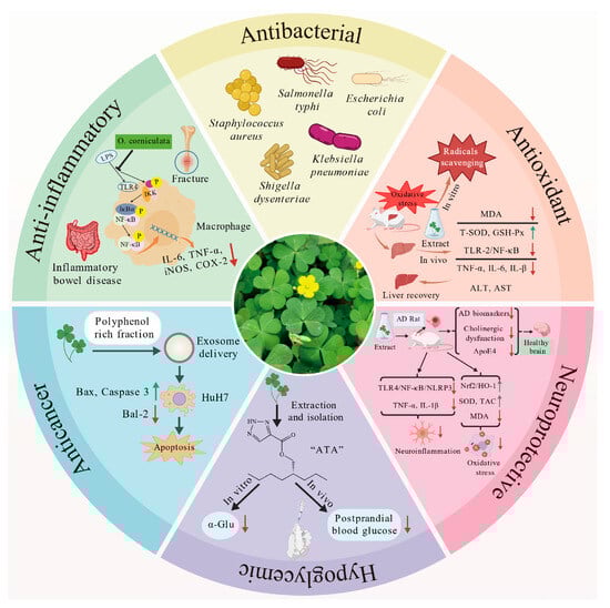 O. corniculata exhibits a wide range of biological activities, increasingly supported by experimental evidence. These effects are largely attributed to the synergistic actions among its diverse phytochemicals, particularly flavonoids, polysaccharides, and phenolic acids. The plant demonstrates notable potential in antioxidant, anti-inflammatory, antimicrobial, hepatoprotective, neuroprotective, hypoglycemic, and anticancer applications. An overview of these biological activities is presented in Figure 4, providing a foundation for the detailed discussions that follow.