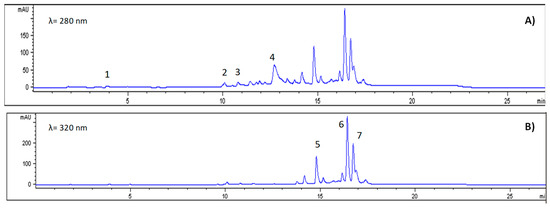 Chromatograms of phenolic compound identification at 280 nm (A) and 320 nm (B). Note: 1, Gallic acid; 2, Chlorogenic acid; 3, Caffeic acid; 4, Ferulic acid; 5, Kaempferol; 6, Quercetin glucoside; 7, Quercetin.