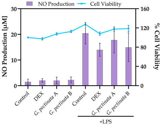 Effects of freeze-dried ethanolic extract of G. pectinata leaves (A, 0.05 mg/mL; B, 0.1 mg/mL) on RAW264.7 macrophages. Note: Nitric oxide production (left y-axis, bars) and cell viability (right y-axis, line) under the same conditions. Data are expressed as mean ± SD (n = 3). No statistically significant differences were observed between G. pectinata leaves + LPS treatments and the LPS-stimulated control.