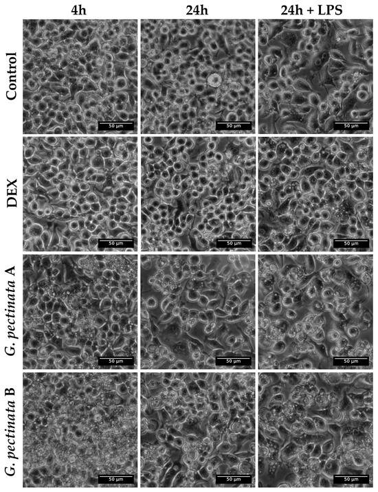 Notably, the extract induced significant morphological alterations, with vacuolization observed as early as 4 h post-treatment at the lowest concentration (A) and persisting for 24 h in both extract-treated groups, irrespective of LPS stimulation (Figure 4). In contrast, cells in the medium-only control and dexamethasone (DEX)-treated groups maintained normal morphology at both time points. In contrast, vacuolization in the LPS control was only observed after 24 h. Importantly, these morphological alterations were observed even though cell viability remained consistently above 95% in all groups. Extract-treated cells reached marginally higher values (117.5% at concentration A and 118.7% at concentration B) relative to the medium-only control, which was set as 100% viability.