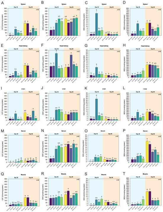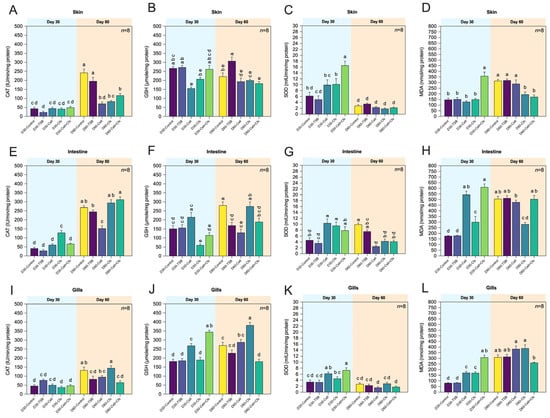 The tissues selected for antioxidant analysis included the spleen, head kidney, liver, serum, muscle, skin, intestine and gills. For sample preparation, approximately 50 mg of each tissue was accurately weighed and homogenized in 1 mL of phosphate-buffered saline (PBS; 0.1 M, pH 7.4). The homogenates were then centrifuged at 1100× g for 10 min at 4 °C, and the resulting supernatants were carefully transferred into microcentrifuge tubes. All supernatant samples were stored at −20 °C until further biochemical analysis.