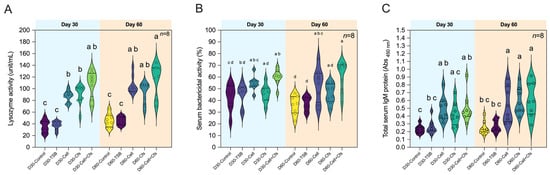 Lysozyme activity was determined according to the method of Parry et al. [] with slight modifications. Briefly, Micrococcus lysodeikticus (Sigma-Aldrich, Darmstadt, Germany) was suspended in phosphate-buffered saline (PBS, pH 6.2) to obtain a final concentration of 0.2 mg/mL, and the suspension was incubated for 1 h prior to use. Subsequently, 10 µL of fish serum was pipetted into each well of a flat-bottomed microtiter plate, followed by the addition of 250 µL of the M. lysodeikticus suspension. The absorbance at 540 nm was measured using a microplate spectrophotometer (iMark™ Microplate Absorbance Reader, BIO-RAD, Hercules, CA, USA) at 0 and 5 min during incubation at room temperature.