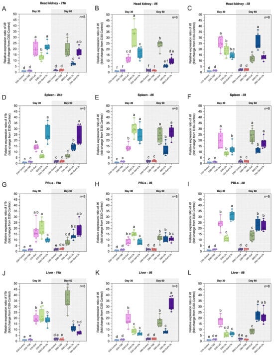 At Day 30, gh expression in the brain was increased only in the Cell + Cfs group compared with D30-TSB (p < 0.05), but did not differ from D30-Control (p > 0.05). In the liver and muscle, gh was significantly upregulated in both Cell and Cell + Cfs compared with controls (p < 0.05), whereas the Cfs group showed no difference (p > 0.05). At Day 60, gh expression in the brain remained elevated in Cell and Cell + Cfs relative to both controls (p < 0.05). In the liver, gh expression in Cell and Cell + Cfs was higher than in D30-Control (p < 0.05) but not significantly different from D30-TSB (p > 0.05). In muscle, gh remained significantly higher in Cell and Cell + Cfs than in both controls (p < 0.05), while Cfs remained comparable (p > 0.05; Figure 2D–F).