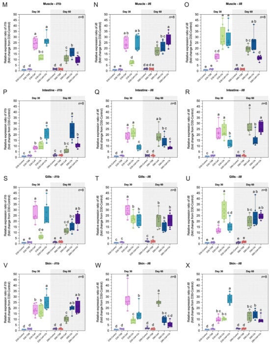The quantitative real-time PCR (qRT-PCR) was performed using QuantiNova SYBR Green PCR chemistry (Qiagen, Germany) on an Azure Cielo™ real-time PCR system (Azure Biosystems, Dublin, CA, USA). The amplification program included an initial denaturation at 95 °C for 5 min, followed by 40 cycles of 95 °C for 30 s, 60 °C for 30 s, and 72 °C for 90 s, with a final extension step at 72 °C for 10 min. The housekeeping genes (actb1 and rna18s) were employed as internal controls to normalize mRNA and cDNA levels, ensuring the reliability and consistency of quantification. Target genes were amplified to evaluate the expression of non-specific immune-related and growth-related genes. All primers were validated for amplification efficiency prior to qRT-PCR analysis.