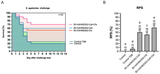 Each fish received an injection of 100 μL of S. agalactiae suspension containing 1 × 106 CFU/mL, equivalent to 1 × 105 CFU/fish. The challenge dose was selected based on preliminary LD50 trials conducted in red tilapia over a 14-day period. Bacterial concentrations were verified by plate counting before and after injection to ensure dose consistency. Fish mortality was monitored daily for 14 days, and survival rate (SR) was analyzed using the Kaplan–Meier method []. The relative percent survival (RPS) was calculated according to the following formula:
