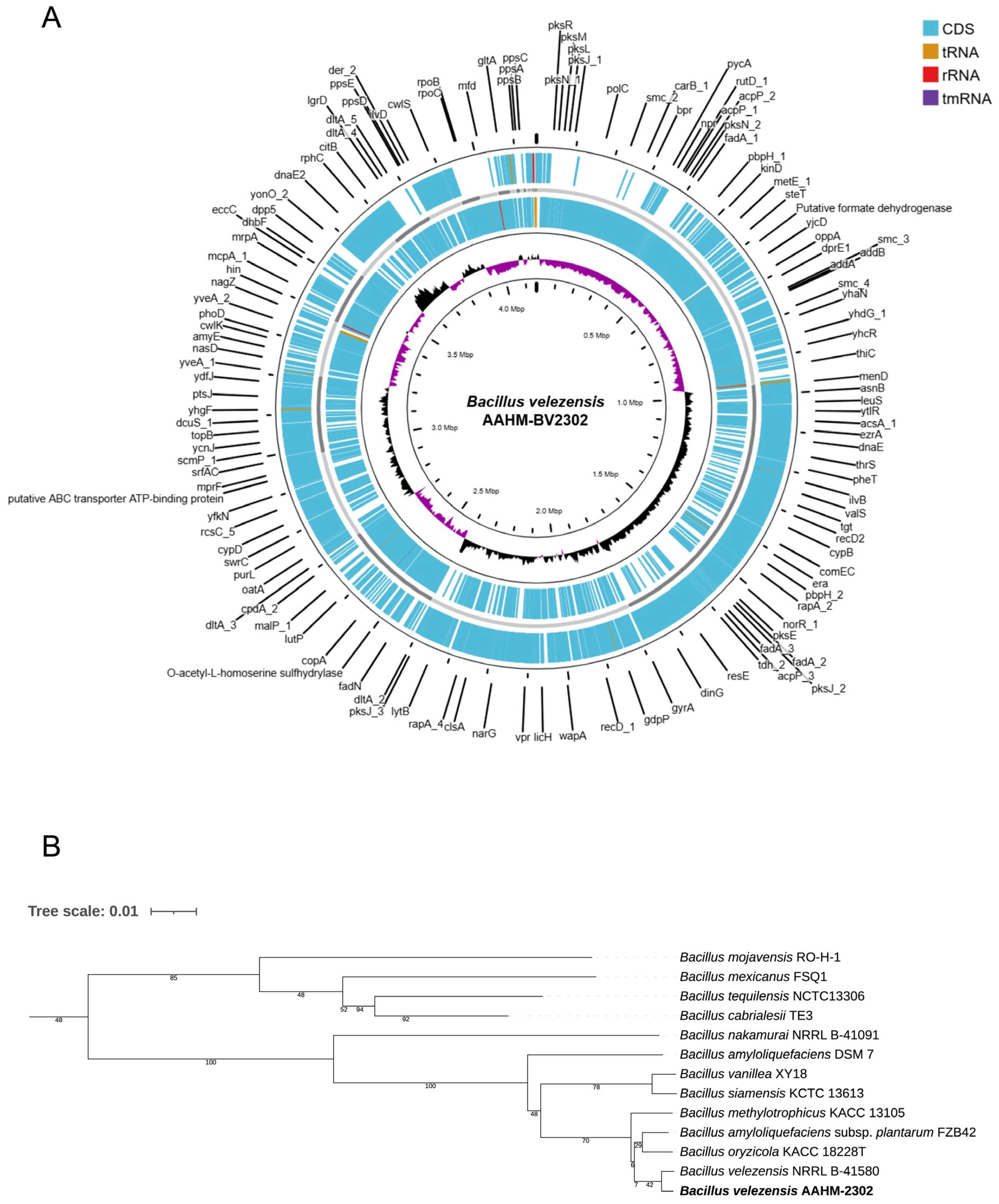Figure 1. Genomic features and phylogenetic relationship of Bacillus velezensis AAHM-BV2302. (A) Circular representation of the draft genome showing coding sequences (CDSs), tRNAs, rRNAs, and tmRNA. The inner rings display GC content and GC skew. (B) Phylogenetic tree based on whole-genome sequences of B. velezensis AAHM-BV2302 and closely related Bacillus species, constructed using the neighbor-joining method. The assembled genome sequence has been deposited in NCBI GenBank under the accession number JBQXGX000000000 and BioProject accession number PRJNA1320929.