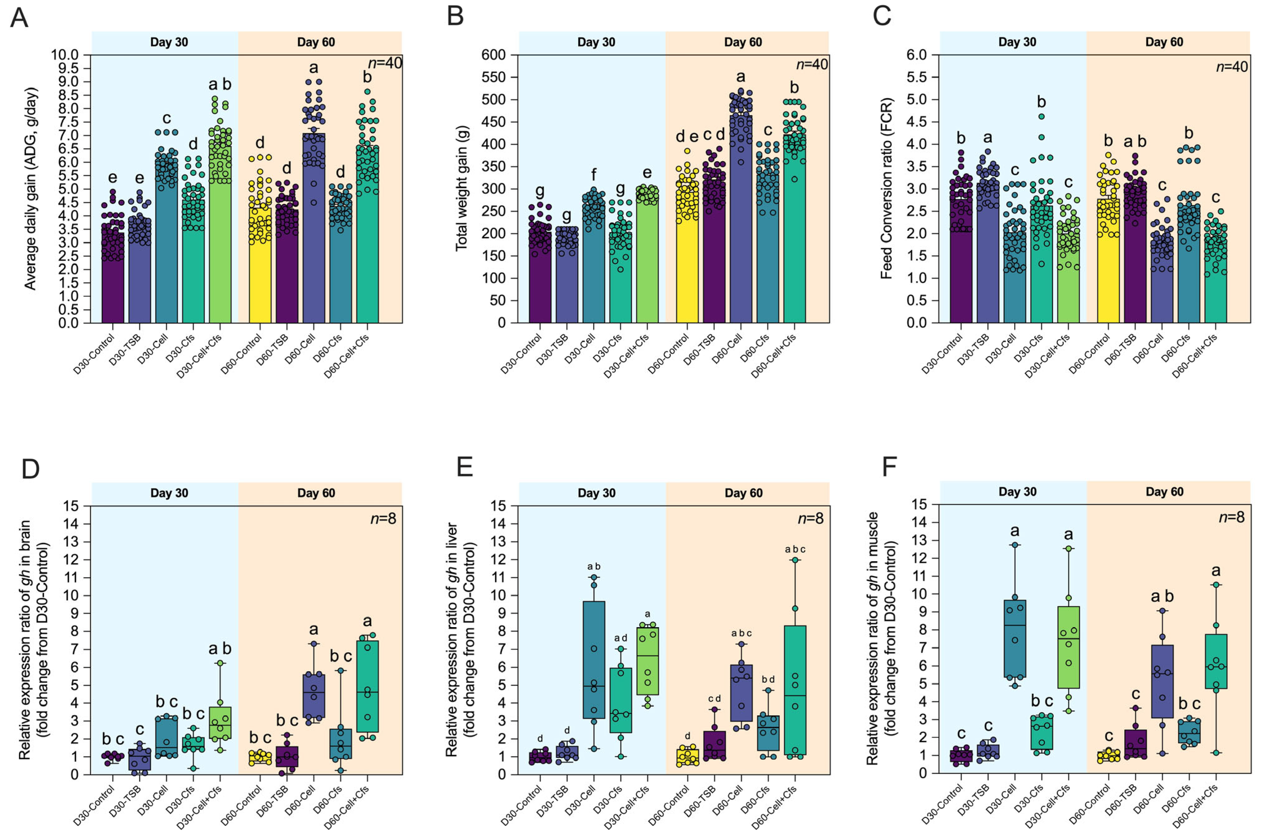 Figure 2. Growth performance and growth-related gene expression of tilapia following dietary supplementation with B. velezensis AAHM-BV2302. Parameters include average daily gain (ADG) (A), total weight gain (TWG) (B), feed conversion ratio (FCR) (C) (n = 40), and relative expression (fold change) of gh in brain (D), liver (E), and muscle (F) after 30 days of probiotic administration (Day 30) and 30 days post-supplementation (Day 60). Data are represented as mean ± SD (n = 8). Different letters above bars indicate statistically significant differences among groups (p < 0.05).
