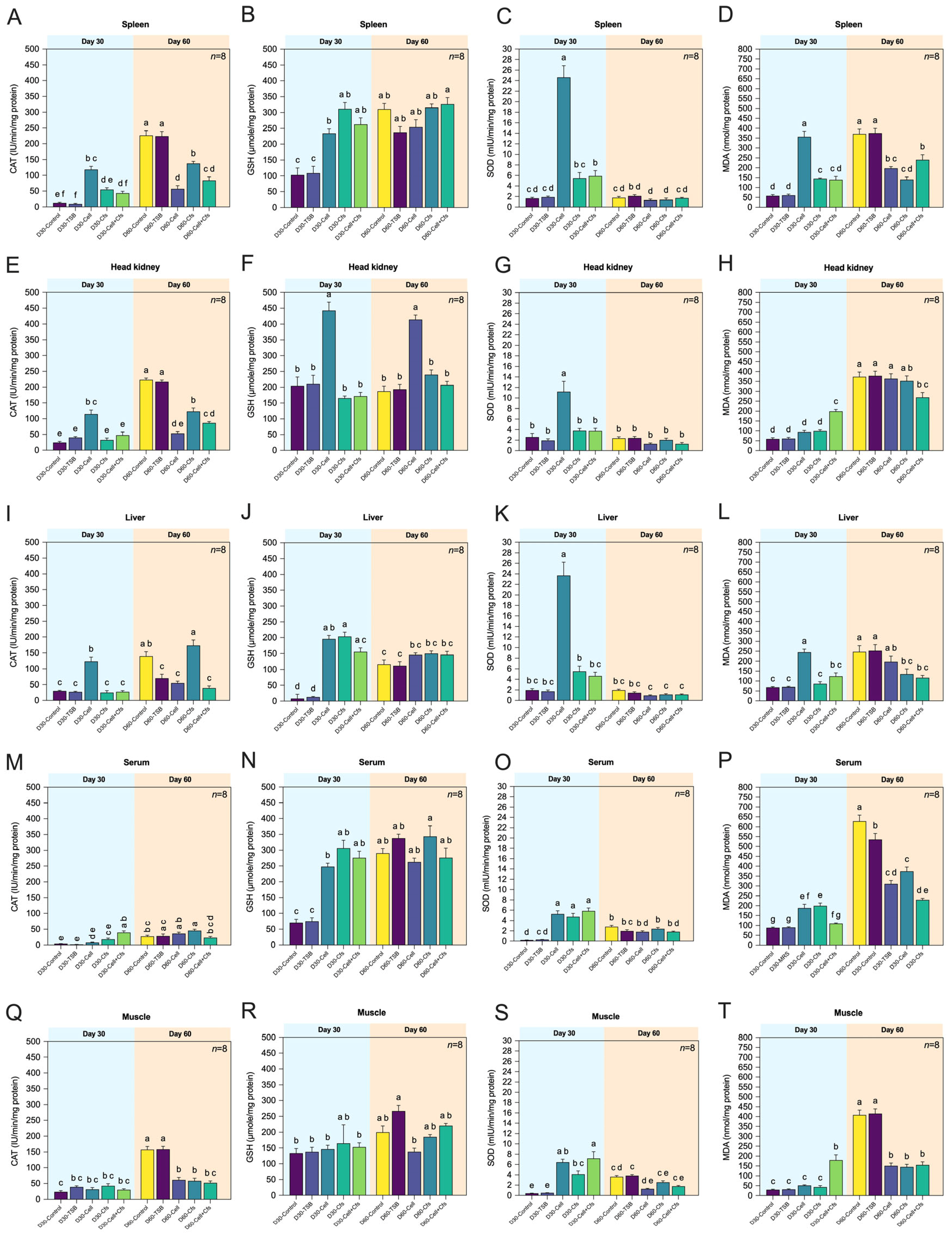Figure 3. Antioxidant enzyme activities including catalase (CAT), glutathione (GSH), and superoxide dismutase (SOD)and levels of malondialdehyde (MDA) in spleen (AD), head kidney (EH), liver (IL), serum (MP), and muscle (QT) of tilapia following dietary supplementation with B. velezensis AAHM-BV2302 after 30 days of probiotic administration (Day 30) and 30 days post-supplementation (Day 60). Data are represented as mean ± SD (n = 8). Different letters above bars indicate statistically significant differences among groups (p < 0.05).