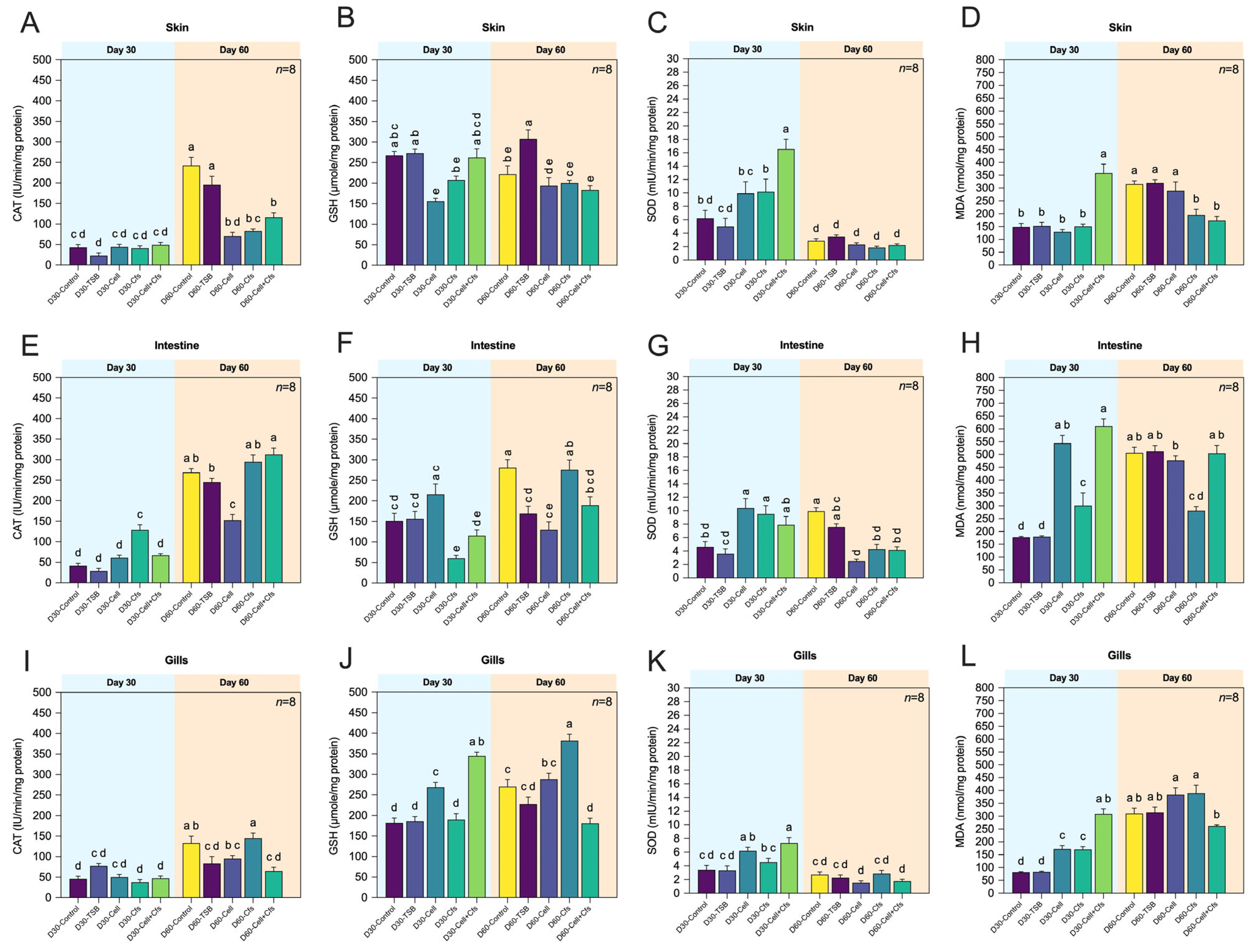 Figure 4. Antioxidant enzyme activities and the levels of malondialdehyde (MDA) in mucosal tissues of tilapia following dietary supplementation with B. velezensis AAHM-BV2302. Tissues include skin (AD), intestine (EH) and gills (IL) after 30 days of probiotic administration (Day 30) and 30 days post-supplementation (Day 60). Data are represented as mean ± SD (n = 8). Different letters above bars indicate statistically significant differences among groups (p < 0.05).