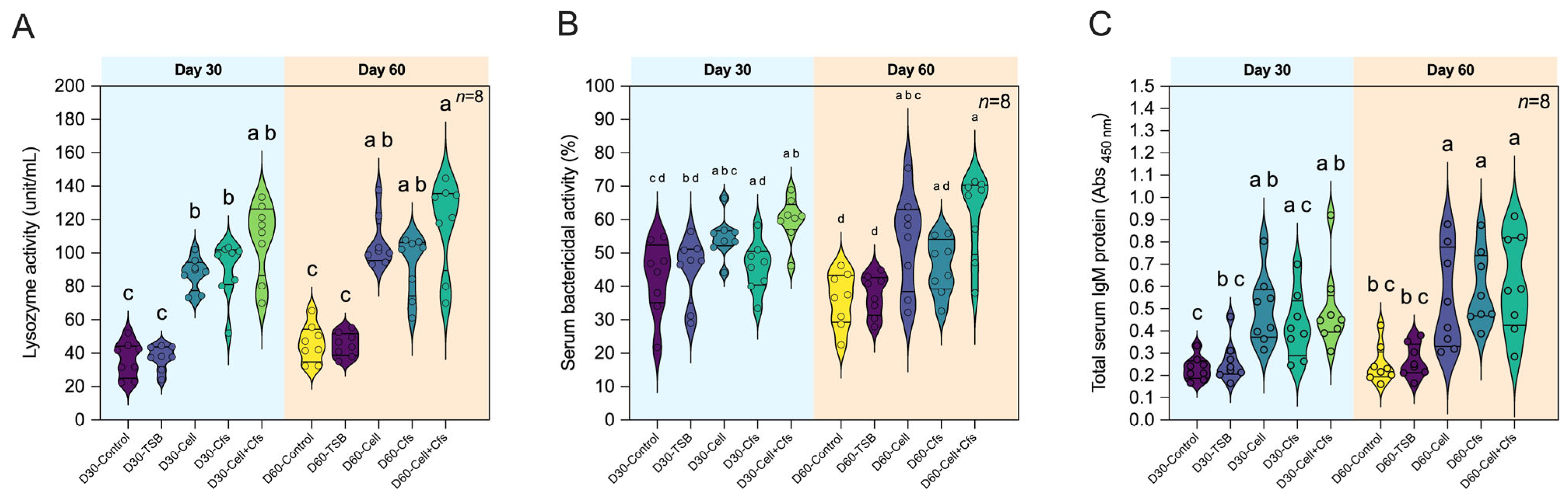 Figure 5. Humoral immune responses of tilapia following dietary supplementation with B. velezensis AAHM-BV2302. Parameters include lysozyme activity (A), serum bactericidal activity (B) and total serum IgM levels (C) after 30 days of probiotic administration (Day 30) and 30 days post-supplementation (Day 60). Data are represented as mean ± SD (n = 8). Different letters above bars indicate statistically significant differences among groups (p < 0.05).