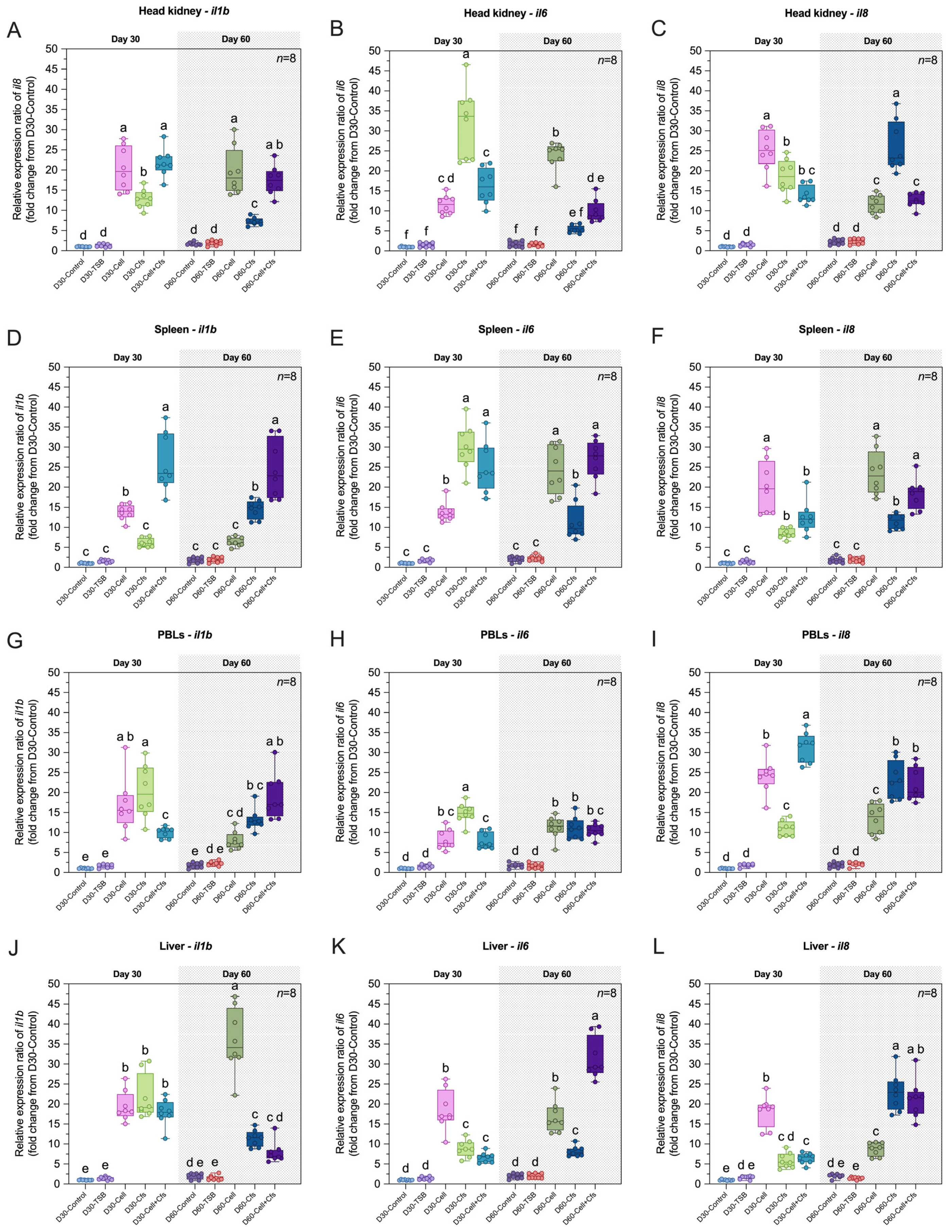 Figure 6. Relative expression (fold change) of immune-related genes including il1b, il6 and il8 in head kidney (AC), spleen (DF), PBLs (GI), liver (JL), muscle (MO), intestine (PR), gills (SU) and skin (VX) of tilapia following dietary supplementation with B. velezensis AAHM-BV2302 after 30 days of probiotic administration (Day 30) and 30 days post-supplementation (Day 60). Data are represented as mean ± SD (n = 8). Different letters above bars indicate statistically significant differences among groups (p < 0.05).