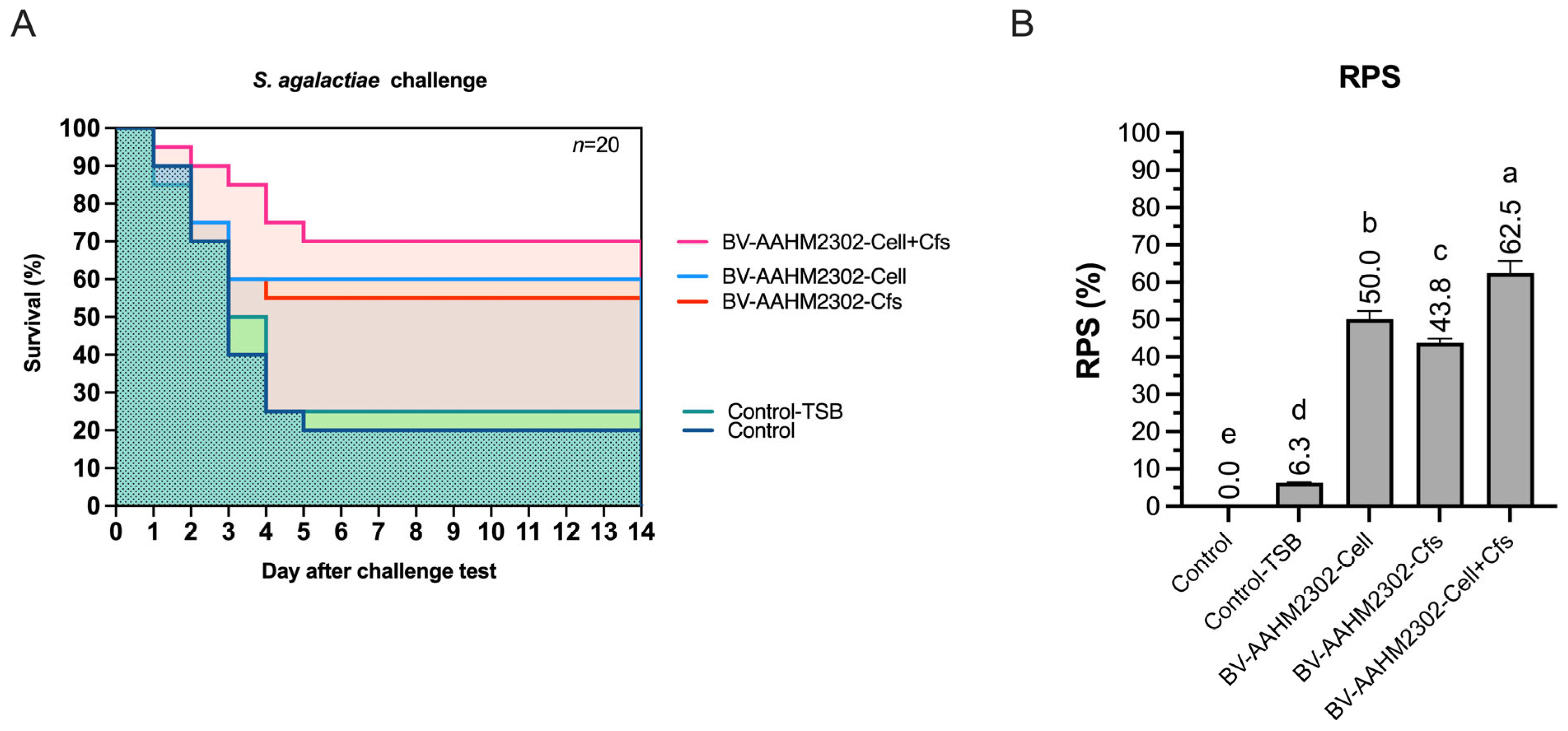 Figure 7. Survival probability (A) and relative percent survival (RPS) (B) of tilapia were determined following S. agalactiae challenge at day 60, after an additional 30 days of dietary supplementation with B. velezensis AAHM-BV2302. Kaplan–Meier survival curves are shown for D60-Control, D60-TSB, D60-Cell, D60-Cfs, and D60-Cell + Cfs groups (n = 20). Different letters above bars indicate statistically significant differences among groups (p < 0.05).