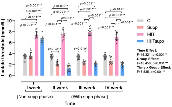 The four-week profiling of plasma lactate threshold is illustrated. Week I represented the non-supplementation phase, weeks II-IV represented the supplementation phase. Blood samples were collected 5 min post-exercise during the HIIT phase. Experimental groups are as follows: C, control group; Supp, CoQ10 supplementation group; HIIT, high-intensity interval training group; HIITsupp, high-intensity interval training combined with CoQ10 supplementation. Data are presented as mean ± SD. Statistical analysis was performed using two-way repeated-measures ANOVA (within-subject factor: time; between-subject factor: group), followed by LSD post hoc tests. Geometric symbols represent individual observations within each bar. Statistical significance is indicated by *: p < 0.05, **: p < 0.01, *** p < 0.001.