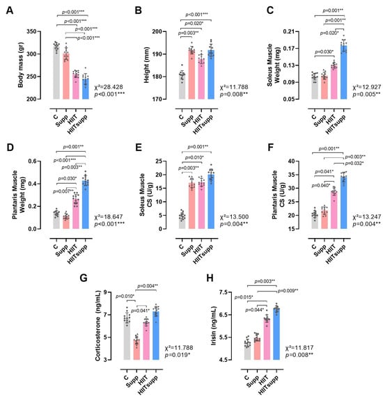 The anthropometric measurements of the experimental groups (A,B), along with the weights of the soleus muscles (C), the weights of the plantaris muscles (D), the soleus muscle CS levels (E), the plantaris muscle CS levels (F), corticosterone levels (G), and irisin levels (H) are illustrated. The experimental groups were as follows: C: control group; Supp: CoQ10 group; HIIT: high-intensity interval training; HIITsupp: high-intensity interval training combined with CoQ10 supplementation. Data are presented as mean ± SD. Statistical analysis was performed using the Kruskal–Wallis test followed by Dunn’s post hoc comparisons. Geometric symbols represent individual observations within each bar. Statistical significance is indicated by *: p < 0.05, **: p < 0.01, *** p < 0.001.