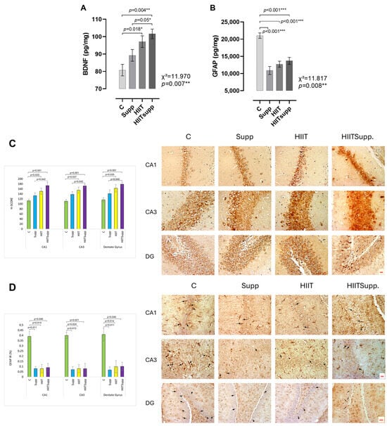 BDNF and GFAP levels in hippocampal tissue homogenates of the experimental groups, as measured by ELISA (A,B), and immunohistochemical staining with quantitative analyses of hippocampal subregions (C,D), are illustrated. BDNF immunostaining images and corresponding immunoreactivity results for the CA1, CA3, and DG subregions (C). Scale bar: 20 µm; magnification: 40× (for all images in (C)). GFAP immunostaining images of the CA1, CA3, and DG subregions. GFAP-positive astrocytes with clearly distinguishable cell bodies and processes are shown (black arrows) (D). Scale bars: 20 µm for CA1 and CA3 (magnification: 40×), and 50 µm for DG (magnification: 20×). The experimental groups were as follows: C: control group; Supp: CoQ10 group; HIIT: high-intensity interval training; HIITsupp: high-intensity interval training combined with CoQ10 supplementation. GFAP: glial fibrillary acidic protein; BDNF: brain-derived neurotrophic factor. Data are presented as mean ± SD. The statistical comparisons were conducted using the Kruskal–Wallis H test, followed by post-hoc Mann–Whitney U tests with Bonferroni correction. The statistical significance is indicated by *: p < 0.05, **: p < 0.01, ***: p < 0.001.