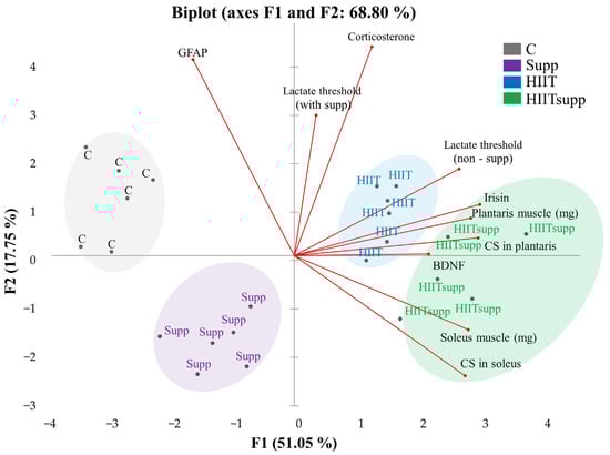 Plasma lactate threshold exhibited significant effects of time, group, and their interaction across the four-week intervention. Thresholds were elevated in the HIIT and HIITsupp groups during the non-supplemented phase but declined following CoQ10 administration in both Supp and HIITsupp groups. Body mass decreased in HIIT and HIITsupp, whereas muscle mass and CS activity peaked in HIITsupp, reflecting enhanced mitochondrial adaptation. Corticosterone levels decreased in the Supp group, while irisin markedly increased in HIITsupp. PCA revealed clear separation: HIITsupp clustered with oxidative and neurotrophic markers (CS, irisin, BDNF), while the C group aligned with higher GFAP and corticosterone, indicating distinct metabolic and neural profiles. HIIT markedly reduced body mass, reflecting enhanced energy expenditure and metabolic adaptation associated with high-intensity training, whereas CoQ10 alone produced minimal change []. Similarly, body mass decreased in the HIIT and HIITsupp groups but remained stable in the others. Although body height increased in all groups, CoQ10 supplementation alone did not affect body weight. HIIT increases plasma lactate levels and activates mitochondrial quality control pathways [,]. During the non-supplemented phase, the HIIT and HIITsupp groups showed higher plasma lactate thresholds compared to the other groups. After CoQ10 supplementation, lactate thresholds decreased, with the greatest reduction observed in the HIITsupp group. PCA indicated that lactate threshold was a key parameter associated with muscle oxidative capacity.