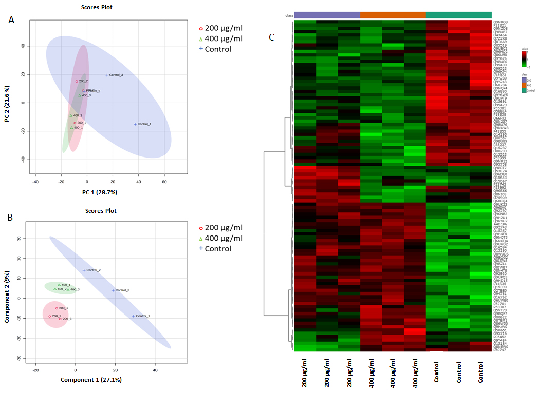 3.6. Analysis of Differentially Expressed Proteins in Untreated Control and 200 µg/mL and 400 µg/mL Nanoceria-Treated Samples
