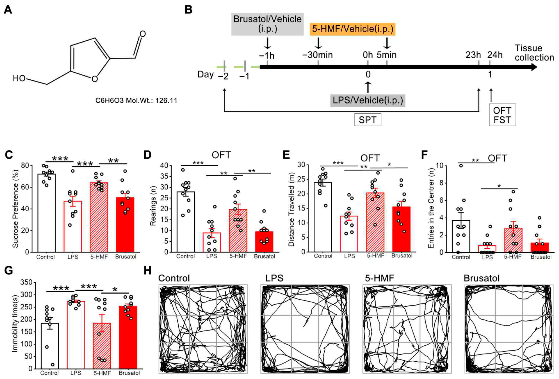 Figure 1. 5-HMF improved depression-like behavior in LPS-induced mice. (A) Chemical structure of 5-HMF. (B) Schematic representation of the experimental procedure. (C) Sucrose preference in the SPT. (D) Rearing frequency in the OFT. (E) Total distance traveled in the OFT. (F) Entries into the central zone in the OFT. (G) Immobility time in the FST. (H) Representative movement trajectory in the OFT. LPS, lipopolysaccharide; SPT, sucrose preference test; OFT, open field test; FST, forced swim test. Results are expressed as mean ± SEM, n = 10 per group.* p < 0.05, ** p < 0.01, *** p < 0.001.