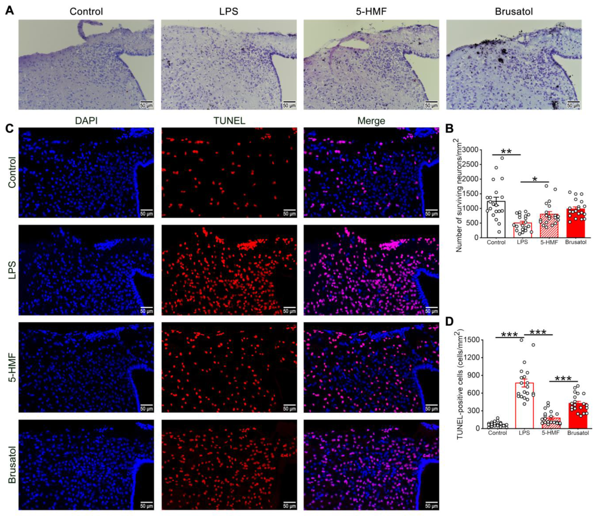 The protective effect of 5-HMF against LPS-induced hypothalamic neuronal injury was further confirmed by TUNEL staining (Figure 3C,D). Compared with controls, which showed minimal TUNEL-positive cells, LPS exposure significantly increased apoptosis. Treatment with 5-HMF reduced the number of TUNEL-positive cells compared with the LPS group. However, brusatol co-administration (5-HMF + Bru) reversed this effect, increasing apoptosis and indicating that brusatol attenuates 5-HMF-mediated neuroprotection. These findings demonstrate that 5-HMF exerts its neuroprotective functions, which is critical for mitigating LPS-induced hypothalamic neurotoxicity.