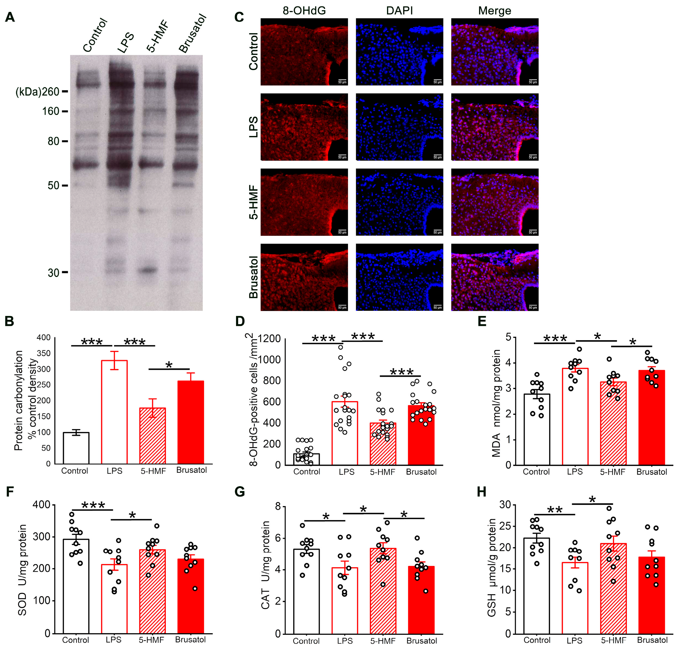 Figure 4. 5-HMF mitigated oxidative stress in the hypothalamus of LPS-induced mice. (A) Representative blot of protein oxidation. (B) Representative photomicrographs of 8-OHdG immunostaining; scale bar, 50 μm. (C) Quantitative evaluation of the optical density of protein carbonyl bands; results are presented as mean ± SE, n = 4 per group. (D) Quantification of 8-OHdG-positive cells, n = 4 per group. (E) Quantification of MDA levels in hypothalamic homogenates, n = 10 per group. (FH) Quantification of SOD, CAT, and GSH levels in hypothalamic homogenates, n = 10 per group. Data are expressed as mean ± SE. * p < 0.05, ** p < 0.01, *** p < 0.001.