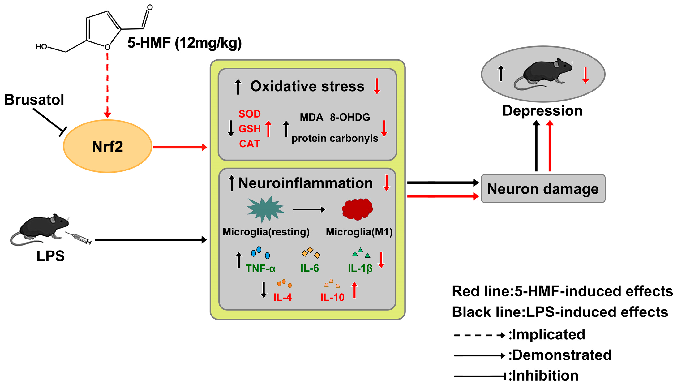 In view of this background, we hypothesized that 5-HMF may attenuate depression-like behaviors by inhibiting oxidative stress and neuroinflammation. We employed an LPS-induced depression mouse model to investigate whether 5-HMF exerts antidepressant effects through inhibition of oxidative stress via activation of the Nrf2 pathway and suppression of microglial M1 polarization–mediated neuroinflammation in the hypothalamus.