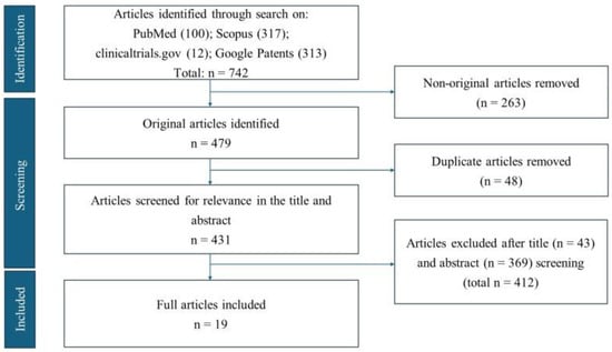 A total of 742 articles were identified during the initial search process. In the first screening phase, 263 non-original articles were removed. Then, 48 duplicate articles were removed. Subsequently, in the last screening phase, an evaluation of titles and abstracts excluded an additional 412 articles. Ultimately, 19 original articles met the inclusion criteria and were used for the final analysis (Figure 1).