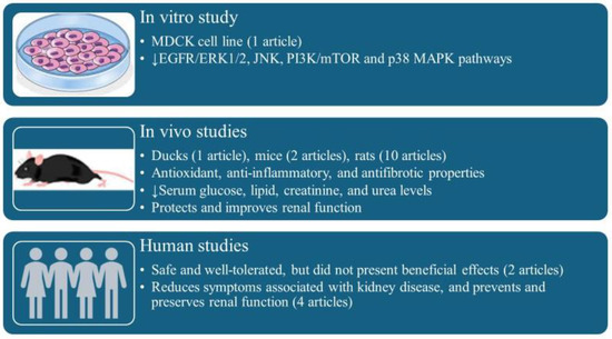 Table 2 summarizes the principal findings of each article. Briefly, curcumin alone or in combination inhibits EGFR/ERK1/2, JNK, PI3K/mTOR, and p38 MAPK pathways in MDCK kidney cells (Figure 2) [45]. Moreover, curcumin exerts antioxidant, anti-inflammatory, and antifibrotic properties and reduces kidney cyst size and number in mice [45,54]. In rats, curcumin replicates effects observed in mice, including reductions in serum glucose, lipid, creatinine and urea levels, and reverses proteinuria, while protecting and improving renal function [46,47,48,49,50,51,52,53,54,55,56,57]. In human studies, curcumin is safe and well-tolerated, reduces symptoms associated with kidney disease, and prevents and preserves renal function [58,59,60,61,62,63].