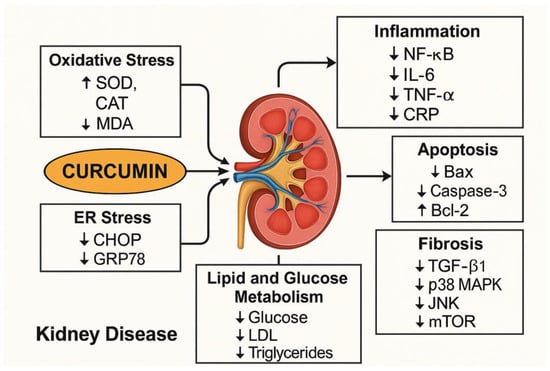 Curcumin exerts pleiotropic actions targeting oxidative stress, inflammation, apoptosis, endoplasmic reticulum (ER) stress, fibrosis, and metabolic dysregulation [64,65] (Table 2 and Figure 3). Its primary renoprotective mechanism involves the attenuation of oxidative stress, a key driver of chronic kidney injury. Curcumin enhances the activity of intrinsic antioxidant enzymes such as superoxide dismutase (SOD) and catalase (CAT), while decreasing levels of malondialdehyde (MDA), a biomarker of lipid peroxidation. This antioxidant activity is crucial for neutralizing ROS and preventing ROS-induced cellular damage in renal tissues [47,49,53].