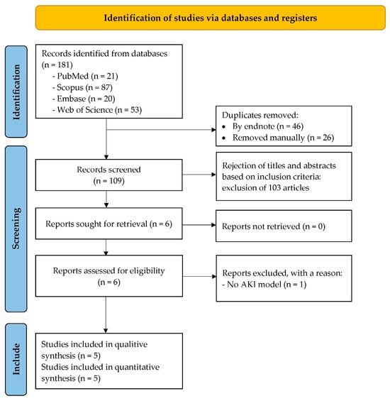 The study selection process is summarized in Figure 1. Initially, 181 records were identified from databases and registers, including PubMed (n = 21), Scopus (n = 87), Embase (n = 20), and Web of Science (n = 53). After removing duplicates (n = 72), a total of 109 unique records were screened based on titles and abstracts, leading to the exclusion of 103 articles that did not meet the inclusion criteria. The full texts of 6 reports were then assessed for eligibility, resulting in the exclusion of 1 report due to the absence of an AKI model. The remaining five studies satisfied the eligibility criteria and were included in the review. These studies were incorporated into both the qualitative and quantitative syntheses.