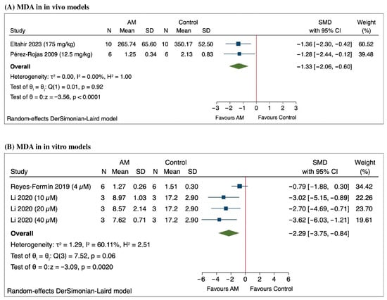 The meta-analysis of the in vitro studies measuring MDA levels following treatment with AM revealed a significant overall reduction, with a SMD of −2.29 (95% CI: −3.75 to −0.84) as shown in Figure 4B. Notably, Reyes-Fermín et al. (2019) reported an SMD of −0.79 (95% CI: −1.88 to 0.30), indicating a trend toward decreased MDA levels, although this was not statistically significant []. Li et al. (2020) demonstrated significant reductions at different concentrations: an SMD of −3.02 (95% CI: −5.15 to −0.89) at 10 μM, −2.70 (95% CI: −4.69 to −0.71) at 20 μM, and −3.62 (95% CI: −6.03 to −1.21) at 40 μM []. Heterogeneity among the studies was substantial (τ2 = 1.29, I2 = 60.11%), and the overall effect was statistically significant, with a Z value of −3.09 (p = 0.0020), based on a random-effects DerSimonian-Laird model. These results support a consistent decrease in MDA levels following AM treatment across the included in vitro studies.