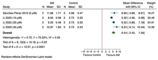 The pooled analysis of the studies assessing the effect of AM on GSH levels in in vivo models revealed a significant overall increase, with an MD of 6.44 (95% CI: 5.40 to 7.49), as shown in Figure 5. Individual studies showed varying effects: Sánchez-Pérez et al., 2010 reported an MD of 6.90 (95% CI: 4.89 to 8.91), Li et al., 2020 at different concentrations demonstrated increases with MDs of 5.32 (95% CI: 4.56 to 6.08) at 10 μM, 6.52 (95% CI: 5.86 to 7.18) at 20 μM, and 8.24 (95% CI: 6.14 to 10.34) at 40 μM [,]. Heterogeneity among the studies was substantial (τ2 = 0.70, I2 = 70.52%, H2 = 3.39), and the overall effect was statistically significant (Z = 12.07, p < 0.0001). These results suggest that treatment with AM significantly increases GSH levels in in vitro models.