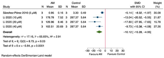 The meta-analysis demonstrated that treatment with AM significantly decreased ROS levels in cells, with a pooled SMD of −10.12 (95% CI: −15.28 to −4.95) as shown in Figure 6. Individual studies showed reductions: Sánchez-Pérez et al., 2010 reported an SMD of −5.14 (95% CI: −8.32 to −1.97), Li et al., 2020 at different concentrations demonstrated SMDs of −13.04 (95% CI: −20.52 to −5.55) at 10 μM, −17.80 (95% CI: −27.95 to −7.65) at 20 μM, and −9.73 (95% CI: −15.38 to −4.08) at 40 μM [,]. Heterogeneity among the studies was substantial (τ2 = 17.16, I2 = 65.65%, H2 = 2.91), and the overall effect was statistically significant (Z = −3.84, p < 0.0001). These results indicate that AM significantly reduces ROS levels in cells.