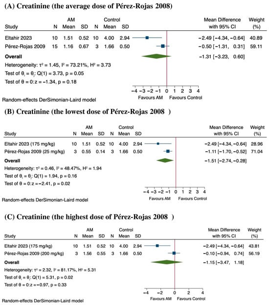 The sensitivity analysis results indicate that AM tends to reduce creatinine levels, suggesting potential nephroprotection, although the outcomes vary depending on the dose [,]. When considering the average values from Pérez-Rojas et al., 2009, there was a MD of −1.31 mg/dL (95% CI: −3.23 to 0.60), with a p value of 0.18, and substantial heterogeneity across studies (I2 = 73.21%) as shown in Figure 8A. At the lowest dose reported in Pérez-Rojas et al., 2009 (25 mg/kg of AM), creatinine levels significantly decreased by an MD of −1.51 mg/dL (95% CI: −2.74 to −0.28), with a p-value of 0.02 and moderate heterogeneity (I2 = 48.47%) as shown in Figure 8B. Conversely, at the highest dose of 200 mg/kg, the MD was −1.15 mg/dL (95% CI: −3.47 to 1.18), which was also not statistically significant (p = 0.33), with considerable heterogeneity (I2 = 81.17%) as shown in Figure 8C. The sensitivity analysis suggested that lower doses of the treatment may be more effective in reducing creatinine levels, while higher doses do not confer additional benefit and may introduce variability. These findings support dose optimization in future studies.