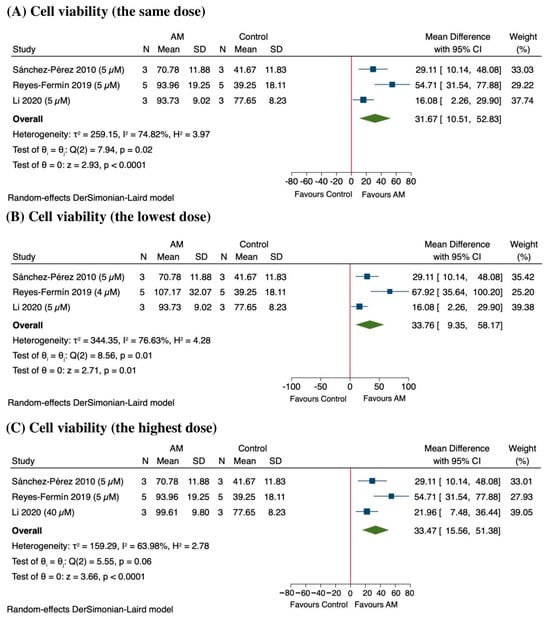 In the sensitivity analysis, the results indicate that AM significantly enhances cell viability across different doses, particularly in studies by Reyes-Fermín et al., 2019, and Li et al., 2020 [,]. At the same dose (5 µM), the pooled MD in cell viability was approximately 31.67%, (95% CI: 10.51 to 52.83; p < 0.0001), indicating a statistically significant improvement as shown in Figure 9A. However, there was substantial heterogeneity among the included studies (I2 = 74.82%), suggesting variability in treatment response. At the lowest dose, the effect remained significant, with a MD of 33.76% (95% CI: 9.35 to 58.17; p = 0.01), although heterogeneity remained considerable (I2 = 76.63%) as shown in Figure 9B. Similarly, at the highest dose, AM treatment resulted in an increase of 33.47% (95% CI: 15.56 to 51.38; p < 0.0001), with substantial heterogeneity (I2 = 63.98%) as shown in Figure 9C. These findings suggest a consistent dose-dependent enhancement of cell viability following AM treatment, although the observed heterogeneity warrants further investigation into potential moderating factors.