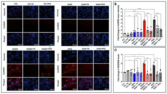 Aβ-mediated ROS generation and protection by antioxidants. Endothelial cells were challenged for 24 h with Aβ1-42, Aβ1-40, and AβQ22 synthetic homologues at a 50 mM final concentration, in the presence or absence of the antioxidants MTZ and TX. (A) Cells stained with CellROX Deep Red with Hoechst nuclear counterstaining. Bars indicate 100 µm for all images. (B) Quantification of CellROX fluorescence assessed via ImageJ Fiji software (Version 1.53t). (C) Changes in ROS/RNS levels evaluated by ELISA. In (B,C) data are expressed as fold change compared to untreated control cells. In both cases, graphs depict mean plus minus SD and black dots illustrate individual data points. * Indicates p < 0.05, ** p < 0.01, *** p < 0.001, and **** p < 0.0001, ns: p > 0.05.