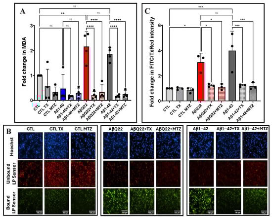 The extent of lipid peroxidation in cells and tissues is an additional indicator of oxidative stress and cellular damage []. Lipid peroxidation mainly results from the reaction of free radicals with polyunsaturated fatty acids in cell membranes and leads to the formation of different lipid peroxidation products, including lipid hydroperoxides and MDA. EC lysates, treated separately with 50 mM Aβ1-42, Aβ1-40, or AβQ22, in the presence or absence of MTZ and TX, were analyzed by ELISA to assess MDA levels. A ~2-fold increase was observed in EC challenged with Aβ1-42 and the AβQ22 variant compared to non-Aβ-treated control cells (Figure 3A). No significant change in MDA was observed in Aβ1-40-treated cells, consistent with the absence of ROS generation illustrated in Figure 2. Co-incubation with both MTZ and TX counterbalanced the increase in MDA levels (Figure 3A).