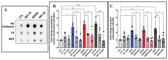 Protein carbonylation refers to a type of protein modification that can be promoted by reactive oxygen or nitrogen species []. Following EC incubation with Aβ1-42, Aβ1-40, or the AβQ22 variant—in the presence or absence of the antioxidants MTZ or TX—protein carbonyl content was estimated in the respective cell lysates via dot blot and ELISA. Both methodologies are based on the reaction of 2,4-dinitrophenylhydrazine (DNPH) with protein reactive aldehyde or ketone residues to form stable DNP hydrazone adducts in a proportional rate to the carbonyls present []. Dot blot analysis shows that all Aβ species tested induced a ~3-fold increase in protein carbonylation, compared to non-peptide controls. In contrast to the lipid peroxidation experiments, ECs challenged with Aβ1-40 induced significant protein carbonylation levels even when ROS formation was not detected. These results may reflect the higher sensitivity of the methodologies used to assess DNP content and/or they may relate to a lower degradation rate of carbonylated proteins, likely leading to their cellular accumulation and their increased detection rate [,]. In all cases, the increased DNP hydrazones content generated by the synthetic homologues was significantly attenuated upon the addition of the antioxidants MTZ or TX (Figure 4A,B). The increase in protein carbonylation was further confirmed via ELISA, which demonstrated a ~2-fold increase in protein carbonylation after challenge with all Aβ peptides tested. As above, supplementation with the antioxidants MTZ and TX significantly decreased DNP hydrazones formation in all cases (Figure 4C).