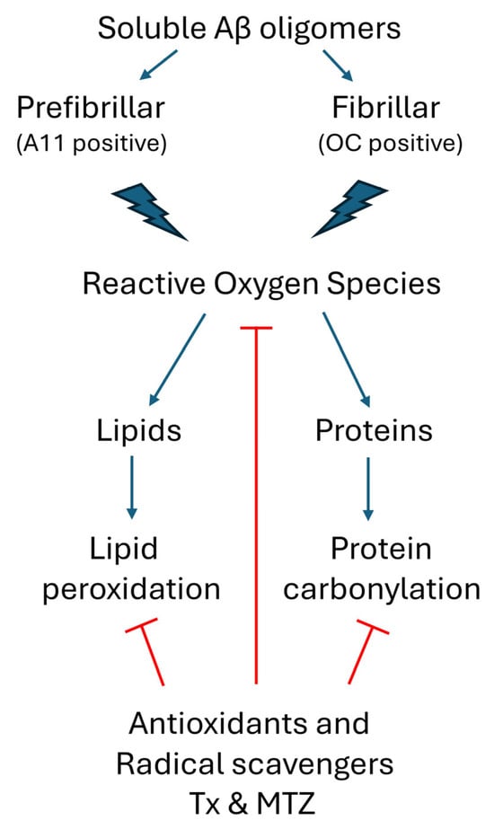 Schematic representation of soluble oligomeric Aβ-mediated ROS generation and the antioxidant cellular response. Prefibrillar A11-positive Aβ oligomers and fibrillar Aβ OC-positive oligomers induce the production of ROS in cerebral microvascular endothelial cells. In turn, these free radical species target cellular lipids and proteins, generating undesirable lipid peroxides and protein carbonyls, both markers of oxidative stress. Pretreatment of the cells with antioxidants TX and MTZ quenches ROS formation, reducing the generation of these chemical modifications to background levels. (Red lines indicate points of inhibition for the antioxidants Txand MTZ).