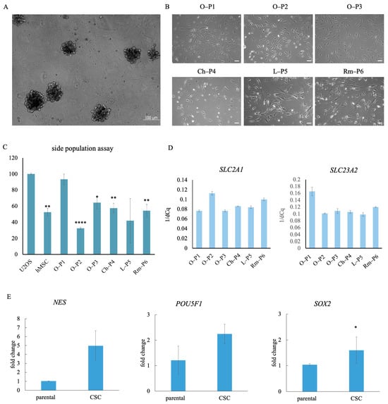 Characterization of cancer stem cells isolated from three osteosarcoma samples, O-P1, O-P2, and O-P3, chondrosarcoma sample, Ch-P4, liposarcoma sample, L-P5, and rhabdomyosarcoma sample, Rm-P6. (A) Sarcoma stem cells grow as sarcospheres. (B) CSCs isolated from six different sarcoma samples exhibit diverse morphologies. (C) Side population assay for control cells (U2OS and hMSC) and sarcoma samples, n = 3, statistically significant difference compared to the negative control U2OS is indicated by * (* p < 0.5, ** p ≤ 0.01, **** p ≤ 0.0001). (D) Relative gene expression analysis of SLC2A1, which encodes GLUT1 and SLC23A2, which encodes SVCT-2, n = 3. (E) Relative gene expression analysis of stemness markers in parental sarcoma cell lines and CSCs isolated after culturing in two generations of sarcospheres. The data are presented as the mean ± standard deviation; n = 5 for NES and n = 3 for POUF1 and SOX2. A statistically significant difference in gene expression compared to the parental cells is indicated by * (p < 0.5).