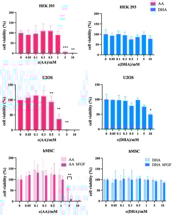 MTT viability assay in control cell lines HEK293, U2OS, and hMSC. HEK293 and U2OS were treated with both ascorbic acid (AA) and dehydroascorbic acid (DHA). When treating hMSCs, AA and DHA were applied in the presence and absence of bFGF to account for its possible influence on cell viability. Data are expressed as percent of negative control, mean ± sd, n = 3. Welch t-tests were performed. Statistical significance: * p ≤ 0.05, ** p ≤ 0.01, *** p ≤ 0.001.