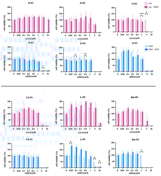 After testing control cell lines, CSC from sarcoma samples were treated for 72 h with AA or DHA in conditions with/without bFGF to evaluate whether the absence of bFGF affects the cytotoxicity of these forms of ascorbate (Figure 3). When treating O-P1 with AA in the presence of bFGF, there is no major effect on the change in viability. However, at 10 mM without bFGF in culturing media, there are no viable cells. The same cells react differently to treatment with DHA: at concentrations 1–10 mM, regardless of bFGF, there is a decrease in viability, abruptly from 1 to 5 mM. When applying AA to O-P2, there is a notable difference in treatments with/without bFGF in the medium. The cells with bFGF in the culturing medium show a slight increase in viability, followed by a gradual decrease from 1 to 10 mM. However, when treating the same cells with DHA, they show a rapid decrease in viability between 1 and 5 mM. AA exhibits an effect on O-P3 at 5 mM with bFGF in culturing medium, while at the same concentration, cells cultured in medium without bFGF show 100% viability. When treating O-P3 CSCs with DHA, they show an increase in viability, followed by a sudden drop at 5 mM, regardless of bFGF (Figure 3).
