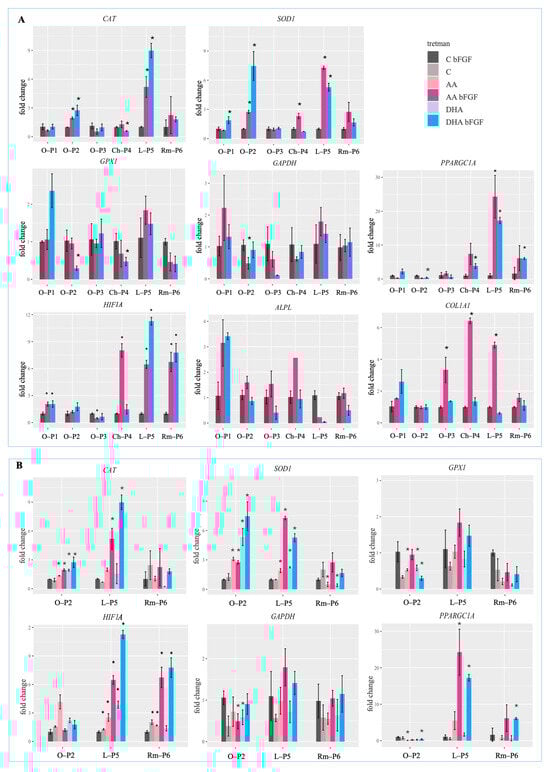 Regarding the gene expression of HIF1A, in the sample O-P2, expression increases in the AA treatment without bFGF, while in all other treatments, expression levels remain almost the same as in the C bFGF control. In sample L-P5, HIF1A gene expression increases in all ascorbate treatments, with the increase being several times greater when bFGF is present in the treatment. In sample Rm-P6, HIF1A gene expression remains nearly unchanged in ascorbate treatments without bFGF, but in treatments where bFGF is present, expression increases approximately six-fold with AA bFGF and about seven-fold with DHA bFGF. Therefore, in the expression of HIF1A, a similar trend can be observed, as in the gene expression of genes related to oxidative stress (Figure 4B).