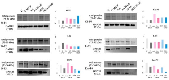 Regarding the expression of GAPDH, in the case of O-P1 and L-P5 treatment with AA, bFGF shows a slight increase in the expression of GAPDH, while the same effect is not observed for DHA bFGF. However, in samples O-P2, O-P3, and Ch-P4, there is a slight decrease in expression of GAPDH induced by both treatments (Figure 4A). When investigating the expression of PPARGC1A, in the samples Ch-P4, L-P5, and Rm-P6, treatments with AA bFGF and DHA bFGF lead to an increase in its expression, while this effect is not observed in osteosarcomas.