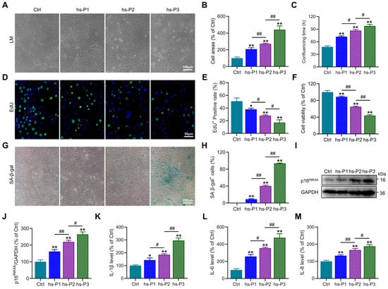 Hyperosmotic stress (400 mOsm/L) induces cellular senescence in HCEPCs. (A) Light microscopic images of HCEPCs treated with 400 mOsm/L hypertonic culture medium from hs-P1 to hs-P3 compared to the Ctrl. (B) Statistical analysis of cell area in A. (C) Statistical analysis of confluencing time in HCEPCs from hs-P1 to hs-P3 compared to the Ctrl. (D,E) EdU staining images and statistical analysis in HCEPCs from hs-P1 to hs-P3 compared to the Ctrl. Representative micrographs display EdU-positive cells (green) and total cells (blue). (F) Analysis of cell viability in HCEPCs from hs-P1 to hs-P3 compared to the Ctrl. (G,H) SA-β-gal staining images and quantitative analysis in HCEPCs from hs-P1 to hs-P3 compared to the Ctrl. (I,J) Western blot images and optical density analysis of p16INK4A expression in HCEPCs from hs-P1 to hs-P3 compared to the Ctrl. (K–M) Secretion levels of IL-1β, IL-6, and IL-8 in HCEPCs from hs-P1 to hs-P3 compared to the Ctrl. hs-P denotes the number of successive passages under 400 mOsm/L hyperosmotic medium. Data are expressed as mean ± SEM (n = 3). * p < 0.05, ** p < 0.01 vs. blank controls (Ctrl), and # p < 0.01, ## p < 0.01 among different experimental groups.